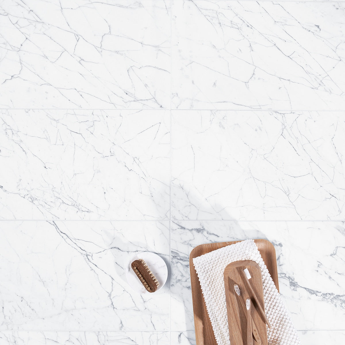 Transform your bathroom walls with the Statuary White Polished 12x24 Marble Tile. The polished surface accentuates the striking patterns of Statuary White marble, adding a touch of chic sophistication to your bathroom.Thassos Honed 12x24 Marble Tile - Timeless Beauty in a Larger Format